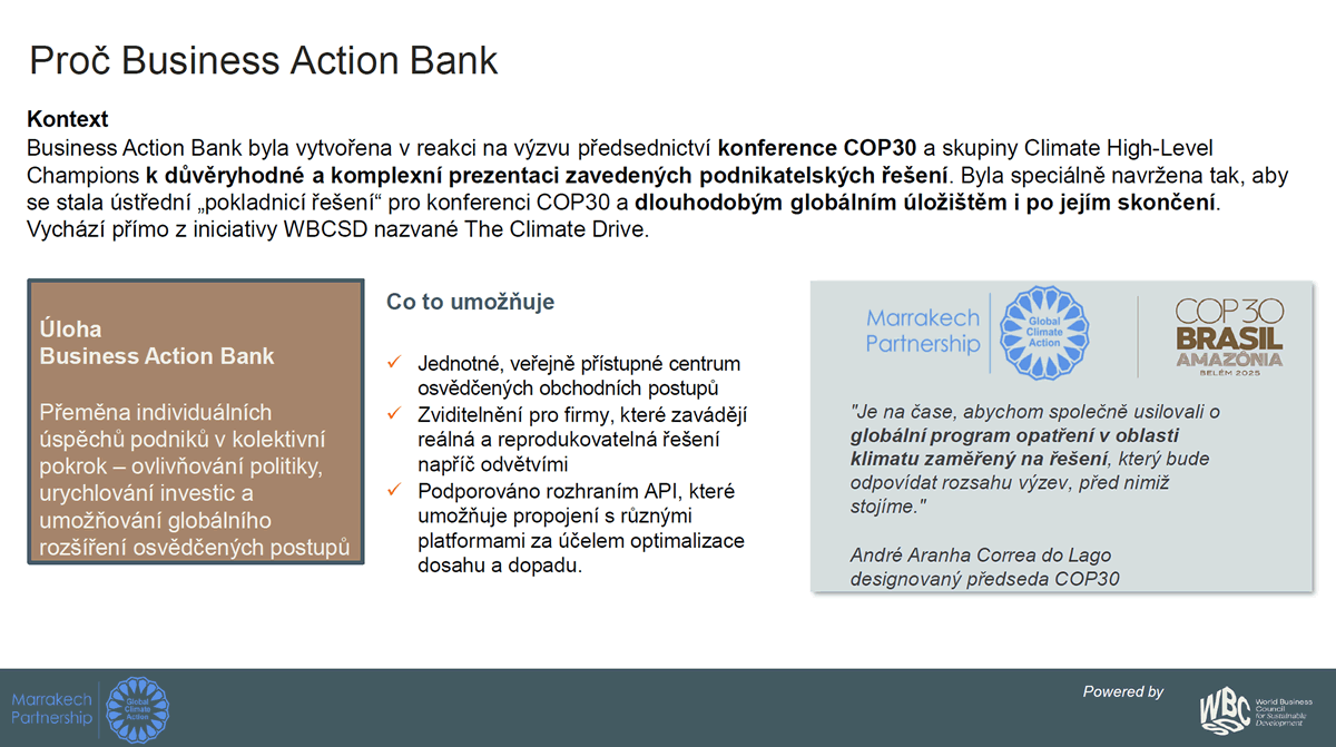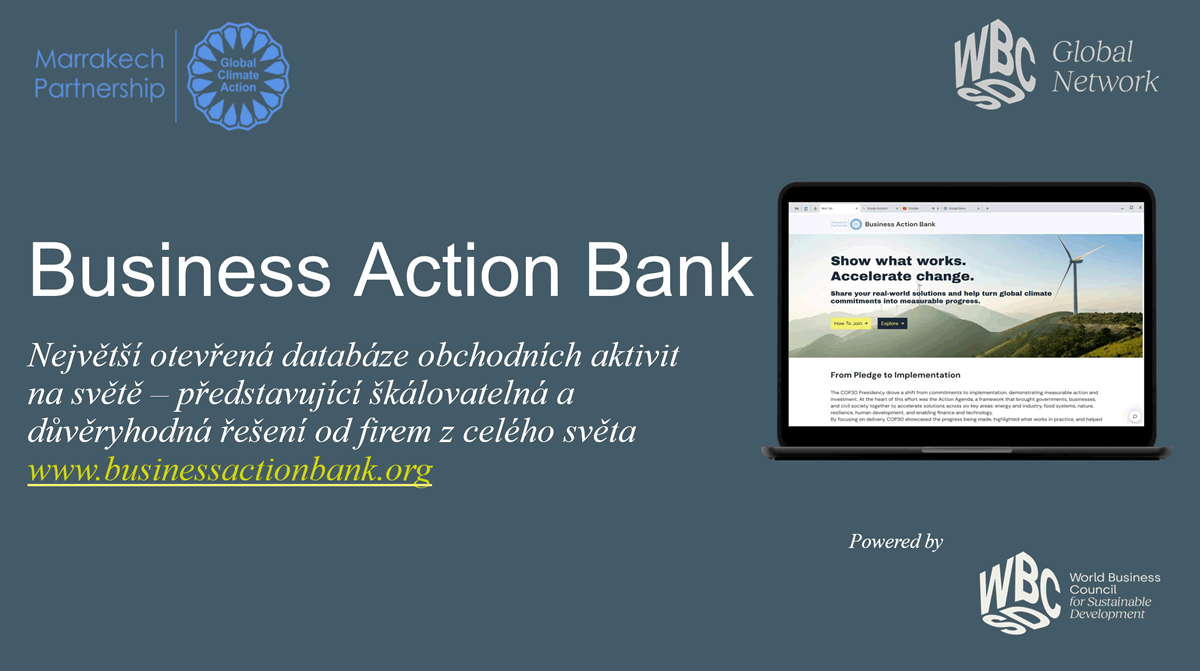 Business Action Bank je největší otevřená globální databáze konkrétních kroků firem v oblasti klimatu a udržitelnosti, která prezentuje ověřená a škálovatelná řešení realizovaná společnostmi po celém světě.